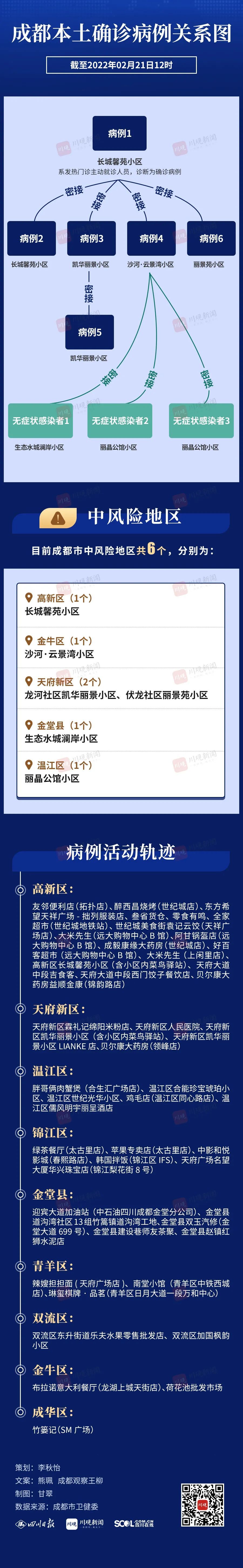 6个中风险地区分别为:高新区长城馨苑小区、金牛区沙河·云景湾小区、天府新区龙河社区凯华丽景小区、天府新区华阳街道伏龙社区丽景苑小区、金堂县生态水城澜岸小区和温江区丽晶公馆小区。