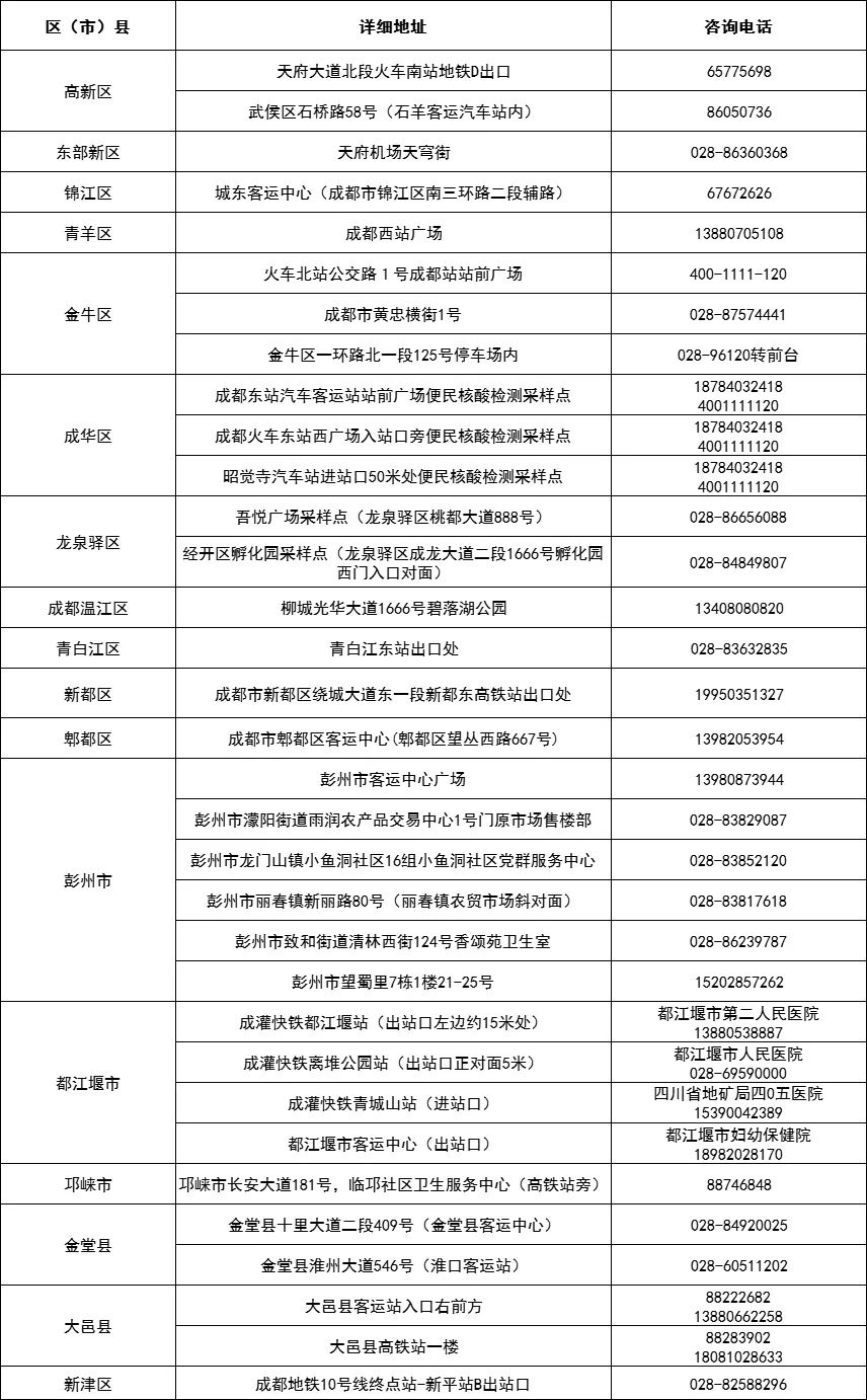 临时核酸检测便民采样点名单