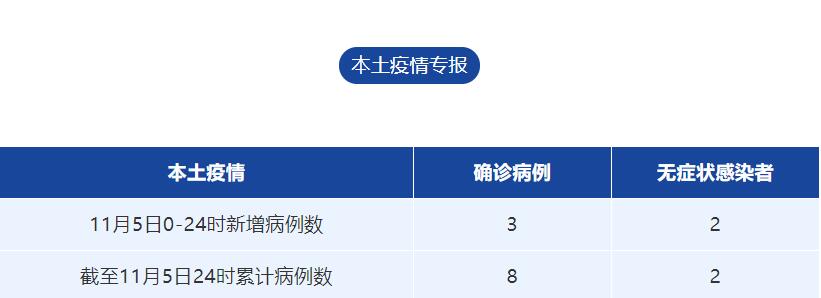 11月5日,我市新增新冠肺炎确诊病例5例,其中本土病例3例,境外输入病例2例(均系昨日通报的境外输入无症状感染者订正)。新增无症状感染者2例,均为本土病例。